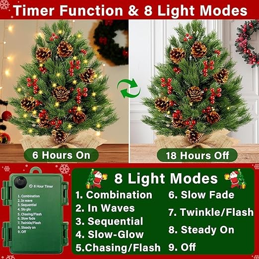【Timer Function】:Designed for convenience, this mini Christmas tree features an automatic timer that keeps the warm LED lights glowing for 6 hours before switching off for 18 hours. Let this artificial lighted Christmas tree create a consistent holiday ambiance day after day, with no need to manually operate—just set and enjoy!