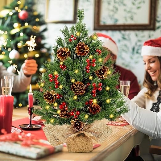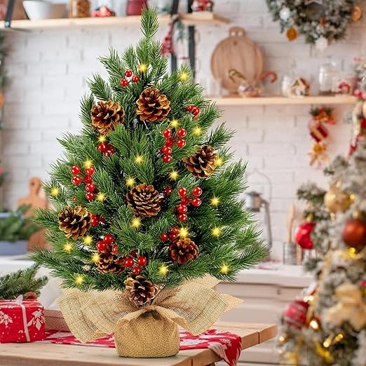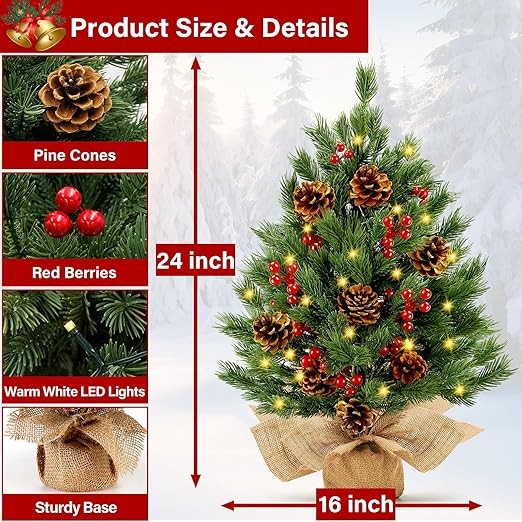 【24 Inch Artificial Tabletop Christmas Tree】:This charming 24-inch mini Christmas tree is an exquisite artificial tabletop Christmas tree, featuring a robust 4x2-inch burlap-wrapped wooden base. Adorned with 55 pine branch tips, 50 warm white lights, 10 pinecones, and 30 red berries, it's the perfect artificial Christmas tree to bring a cozy, festive atmosphere to any space!