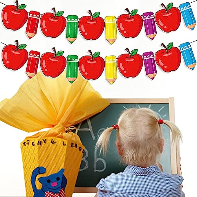 ?The Pencil and Apple Banner is perfect for students back to school party decorations, first day of school first day of kindergarten party decorations, school classroom welcome back party decor, or classroom, daycare, office, elementary, high middle school, university, college, kindergarten graduation decorations.