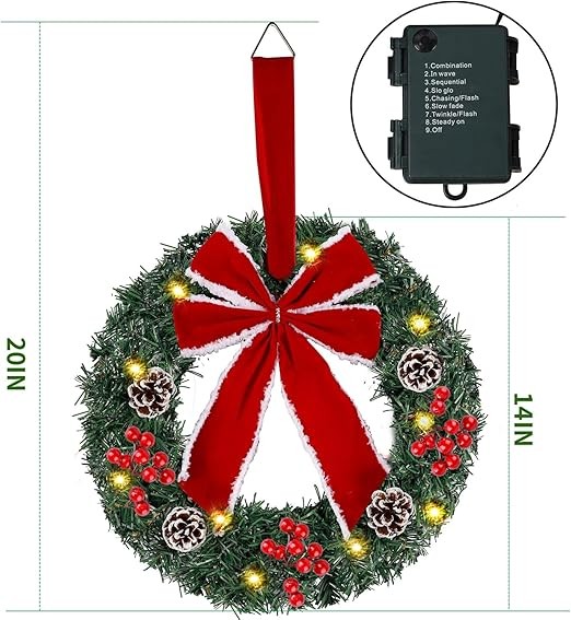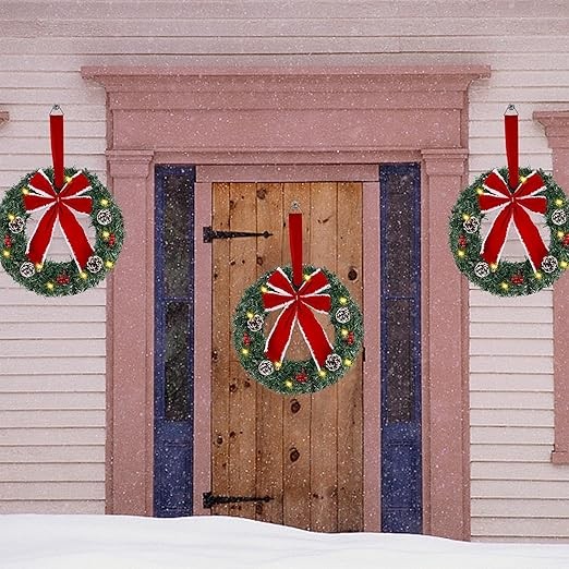 Set of 3 Lighted Christmas Wreaths: Embellished with a collection of large red velvet bowknot and some enchanting realistic pine leaves, 3 clusters of red berries and 4 pine cones, these light up Christmas wreaths will bring an animate and enjoyable ambiance to your home. Perfect for Xmas decor and looks gorgeous indoor or outdoor covered porch