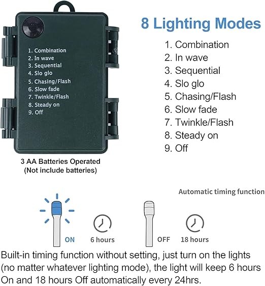8 Lighting Modes & Timer: These Xmas decor have 8 lighting modes for you to choose- combination, in waves, sequential, slogs, chasing/flash, slow fade, twinkle/flash, and steady on. adjust the lighting modes by pressing the round button on the waterproof mode controller box. Comes with built-in auto timer function without setting (6 hrs ON, 18 hrs OFF) for any lighting mode, perfect for the holiday season, and then not have to worry about turning your lights on or off every day