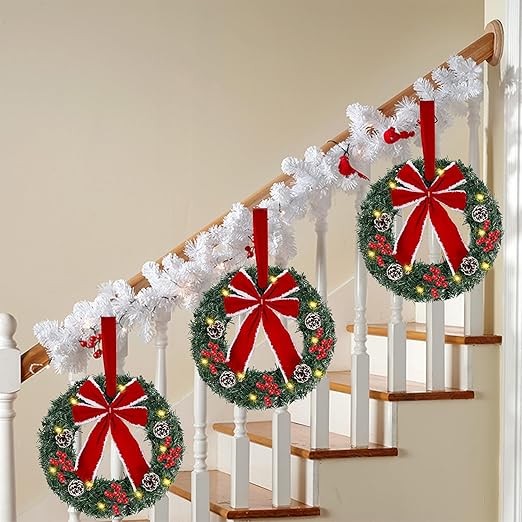 Hausse Set of 3 Christmas Wreaths, Lighted Artificial Christmas Wreath with Large Red Bow & Ornaments, Battery Operated with LED Lights, for Front Door Gate Wall Christmas Party Decorations