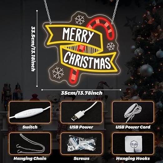 【Dual Hanging & Tabletop Use】This hanging christmas neon sign includes a detachable chain, letting you mount it on doors, windows, or walls effortlessly. Remove the chain, and this versatile piece becomes a tabletop christmas neon light, perfect for mantels, desks, or the floor beside your Christmas tree—adapting to all your decor needs.