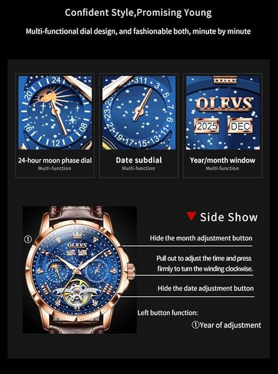 ?OLEVS Men's Automatic Watch: Package includes watch/gift box/free adjustment tool(for stainless steel band)/user guide. If you encounter problems when using the watch, you can contact us through Amazon and a professional after-sales team will provide you with service.